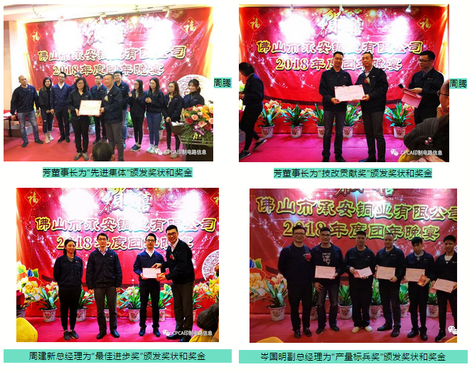 2019年1月29日晚,佛山市承安銅業(yè)有限公司在公司行政樓隆重舉行2018年度團年晚宴;周騰芳董事長(cháng)、周建新總經(jīng)理、岑國明副總經(jīng)理及公司全體員工參加了團年晚宴;中國電子電路行業(yè)協(xié)會(huì )(CPCA)顧問(wèn)梁志立高工、廣東省電路板行業(yè)協(xié)會(huì )副秘書(shū)長(cháng)陳世榮副教授等嘉賓也參加了晚宴。