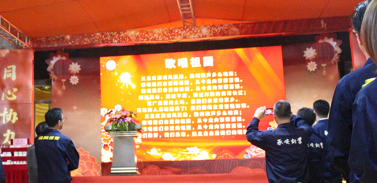 團年晚宴以一首《歌唱祖國》在董事長(cháng)周騰芳、總經(jīng)理周建新、副總經(jīng)理岑國明的帶領(lǐng)下,全體員工高歌齊唱,向剛剛過(guò)去的祖國70周年華誕致禮,向我們深?lèi)?ài)的偉大祖國深情表白,同時(shí)也拉開(kāi)了本次團年晚宴的序幕。